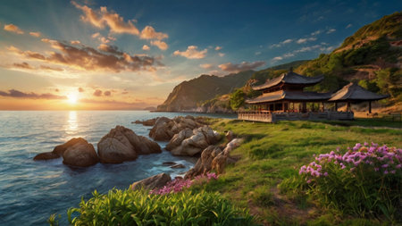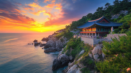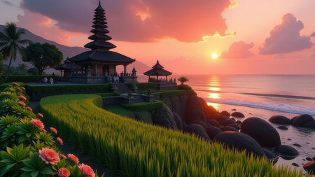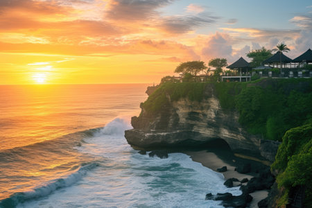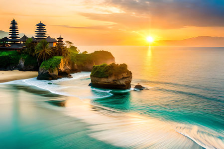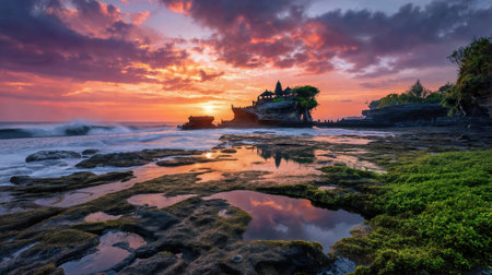 A breathtaking sunrise illuminates a coastal temple perched atop a rocky outcrop.