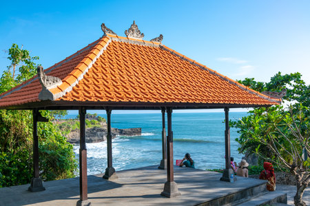 Bali, Indonesia - March 24, 2017: Visitors at the entrance of the Tanah Lot temple on the shores of the sea