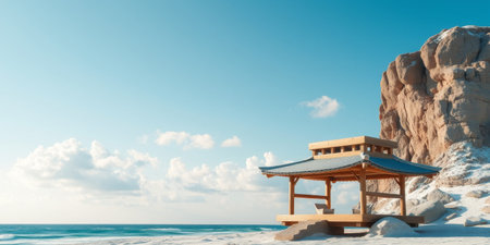 A small white building sitting on top of a sandy beach. Generative AI. Festive background with copy-space.