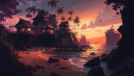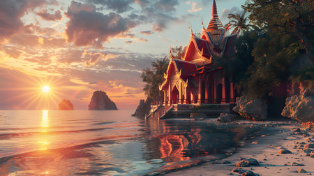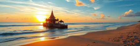 A picturesque scene of a temple on a sandy beach with a breathtaking sunset in the background. The temple stands tall, bathed in golden light, as the sun dips below the horizon, painting the sky in vibrant hues of orange, pink, and purple.