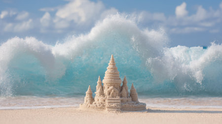 A stunning sandcastle stands proudly on the sandy beach, framed by powerful ocean waves. This picturesque scene captures the beauty of nature and creativity.