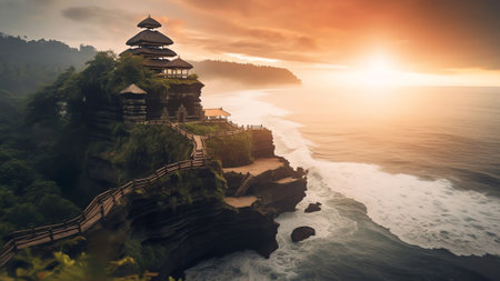 Generative AI : Aerial view of Tanah Lot Temple at sunset in Bali Indonesia