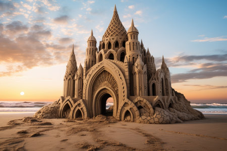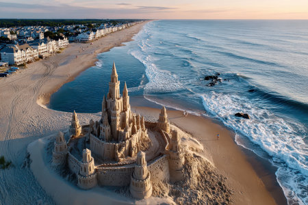A stunning sandcastle adorned with seashells sits on the beach, bathed in the warm glow of sunrise, evoking a sense of peace and creativity in a coastal paradise.