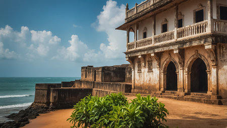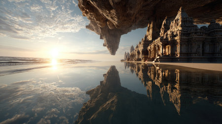 Captivating view of an ancient temple alongside a tranquil beach, captured at sunrise. The stunning reflection in calm waters evokes peace and wonder.