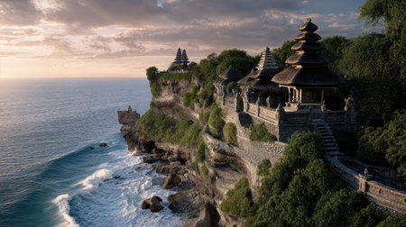 A stunning coastal view of a temple at sunset, surrounded by rocky formations and the calm sea. A perfect scene for relaxation and reflection.