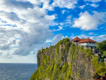 Uluwatu temple, Pura Luhur Uluwatu, Bali, Indonesia, where dramatic coastal cliffs, radiant sunsets, and expansive ocean views evoke a timeless aura of cultural spirituality.