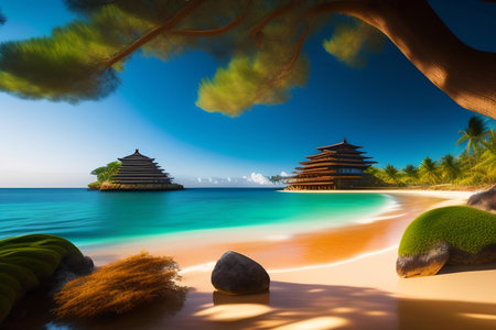 Pagoda on the tropical beach at sunset. 3D rendering