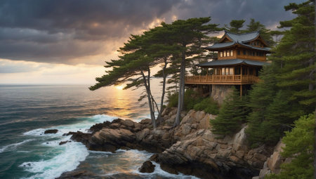 An AI generated illustration of an idyllic beach house situated on rocky terrain overlooking the ocean