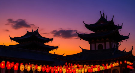 Illuminated lanterns adorn ancient Chinese architecture at dusk. Generative Ai
