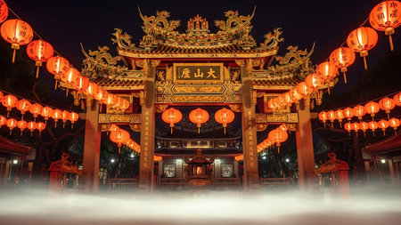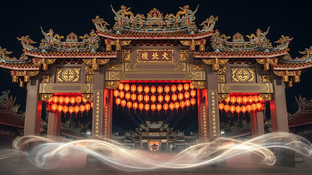 Cultural gateway landmark with vibrant hanging lamps creates an atmospheric view perfect for travel themes.