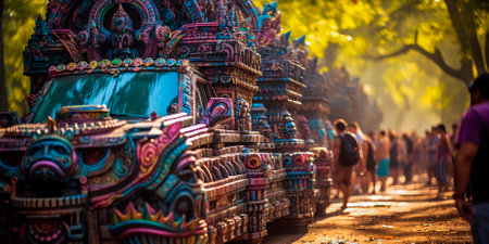 Vibrant festival atmosphere with a colorful temple procession under umbrellas in a crowded Indian street.