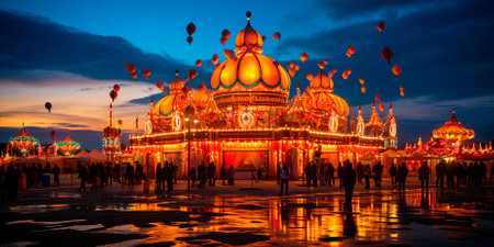 During a colorful festival, a stunning temple rises majestically against a bright blue sky.