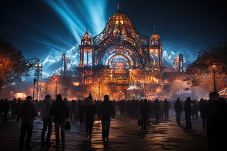 Festival Night: crowds, bright performances and petal clock., generative AI