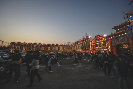 Night image of decorated Durga Puja pandal, Durga Puja is biggest religious festival of Hinduism. Shot at colored light, in Kolkata, West Bengal, India on October 2018