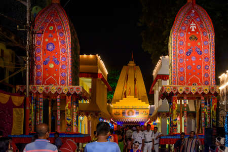 Ratha-yatra festival of Lord Jagannatha, Balabhadra and Subhadra during the annual Rathayatra in Odisha in the background. Happy Hindu India
