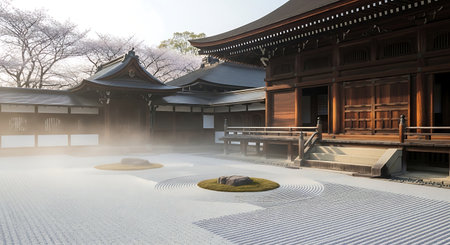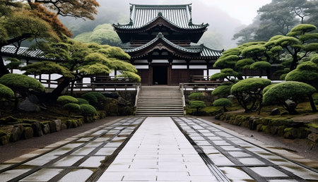 Misty morning view of a serene Japanese temple garden. Tranquil scene with a paved path leading to the temple.