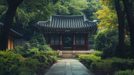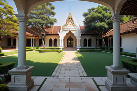 Enchanting Expanse: Captivating Asian Temple Facade Amidst Lush Greenery in the Garden