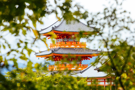 A stunning view features a traditional Japanese pagoda surrounded by the vibrant greenery of beautiful Kyoto