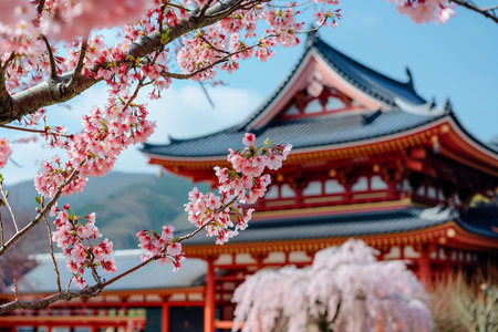 cherry blossoms (Sakura) with a traditional Japanese building in the background in Kiyomizu Dera Temple