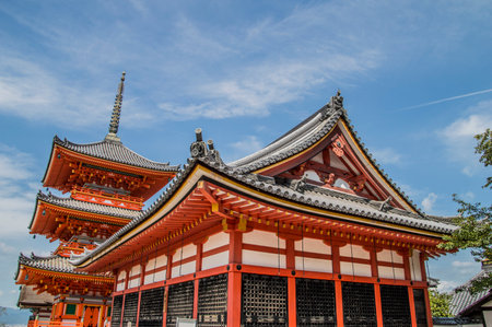 Kyoto, Japan - October 16, 2023: Symmetrical upward view of the vividly painted eaves and tiled roofs of the Sanjunoto Three Story Pagoda at Kiyomizu-dera temple, with a clear blue sky and scattered clouds in the background.