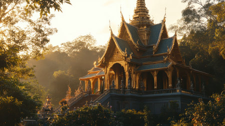A stunning ancient temple set amidst lush greenery, illuminated by soft morning light. This serene structure showcases intricate architecture and invites reflection.