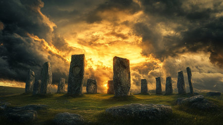 Stonehenge at sunset. 3d render. Fantasy landscape.