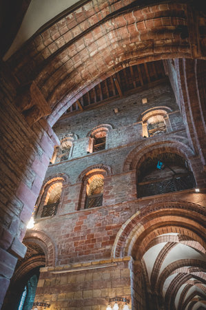 Illuminated Inside of St Magnus Cathedral at Kirkwall, Scotland, low angle view, vertical shot