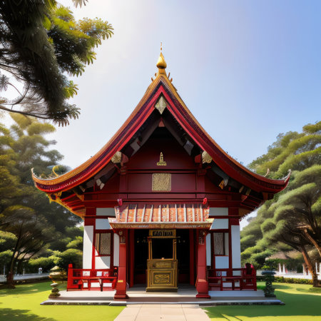 A striking example of traditional Asian architecture showcasing rich red pillars and golden accents, set in a tranquil garden environment.