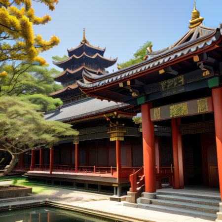 Asian architectural masterpiece with ornate roof details and vivid colors, highlighting cultural significance and artistic craftsmanship in a tranquil environment