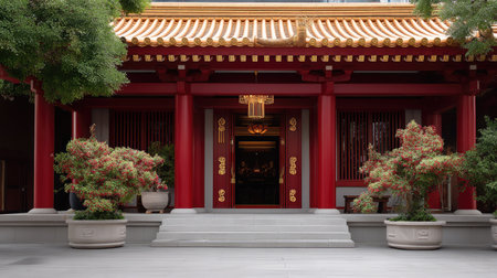 Enchanting Expanse: Captivating Asian Temple Facade Amidst Lush Greenery in the Garden