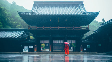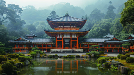 A tranquil Japanese temple nestled amidst vibrant greenery, showcasing exquisite architectural details and natural beauty, perfect for serene retreats.