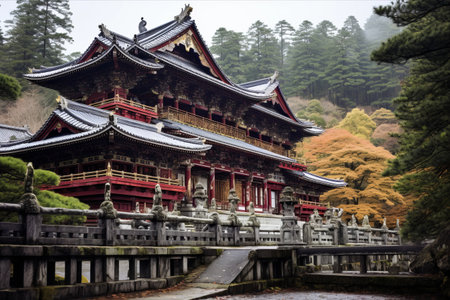 An architectural image showcases a temple complex featuring red structures and bridges. The scene is bathed in natural light, surrounded by lush green trees. The composition may be suitable for cultural publications or travel promotions, potentially serving various commercial and editorial needs without brand identification.
