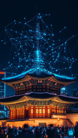 Traditional Asian Architecture Meets Modern Light Installation, Illuminated Temple Pagoda at Night