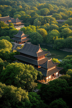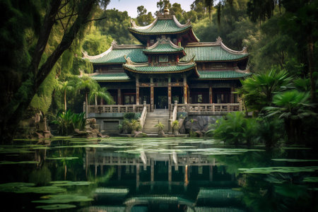 An AI generated Asian building near tranquil body of water surrounded by lush trees