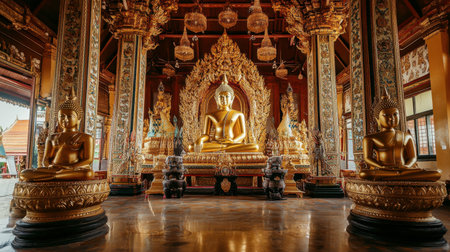 A stunning Buddha statue sits gracefully in an ornate temple, surrounded by intricate decorations and architectural beauty, evoking spirituality and tranquility.