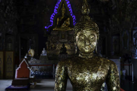 The old of golden color of Buddha statue in Thai temple (public place)