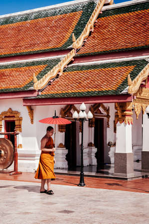 SEP 16, 2012 Sakon Nakhon, Thailand - Buddhist monk with umbrella walking in Wat phra that choeng chum, sacred temple of Sakon Nakhon - Thailand