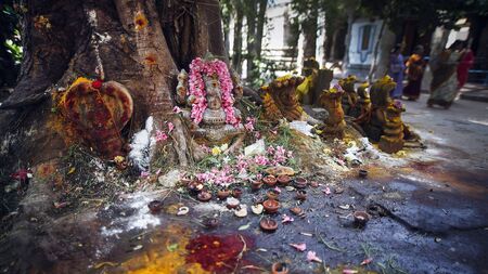 The altar of Hindu gods at the sacred tree in one of many temple complexes in Madurai India