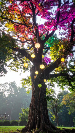 Photorealistic ancient tree with rainbow-colored leaves forming a luminous canopy, glowing hanging lanterns, misty forest background, no faces, no text, generous copy space