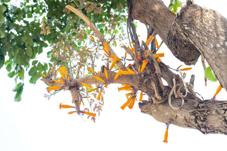 A branch bearing vibrant orange flowers is set against a serene, clear blue background. The image showcases natural elements with a focus on color and texture. Its composition and lighting suggest outdoor conditions, ideal for commercial uses promoting nature or botanical themes.