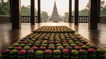 Cinematic wide angle (16:9) photograph of numerous traditional Khao Niao (sticky rice) servings, tig