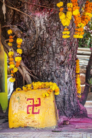 Swastika symbol on the stone and Saffron flower garlands near Arambol beach temple, Goa, India