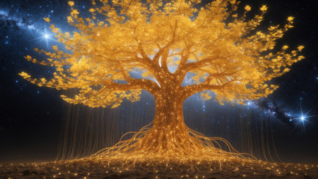 Golden tree glowing under a starry night sky with radiant roots illuminating the dark landscape