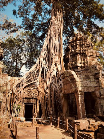 Giant anyan tree covering Ta Prom and Angkor Wat temple, Siem Reap, Cambodia