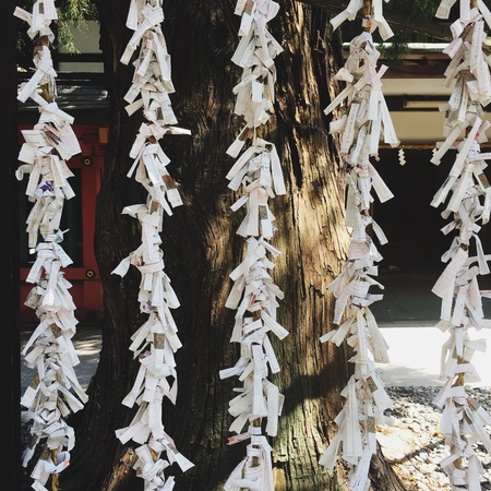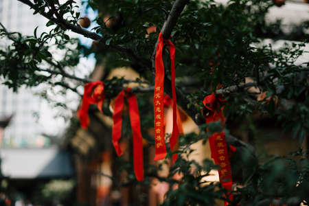 Shanghai, China; Nov 28 2017: Red ribbons hanging from a tree with chinese lettering
