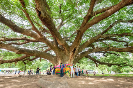 Kanchanaburi, Thailand : Aug 14 2017 : Tourists enjoying the surrounded big rain tree