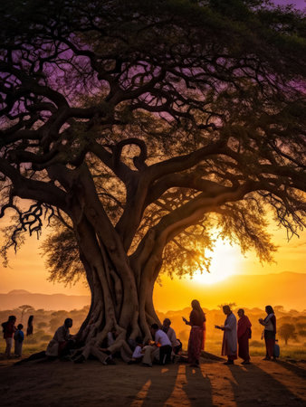 A diverse group of individuals stands in a circle, holding hands beneath a sprawling ancient tree as the sun sets in the background. The warm golden light filters through the trees leaves, creating a magical atmosphere. Everyone appears engaged in a shared experience, embracing the moment of togetherness and connection to nature. The peaceful surroundings enhance the sense of community and harmony among the participants.