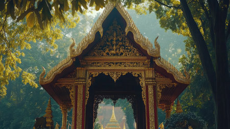 Ornate entrance gate of a Thai temple with intricate gold and red patterns, framed by tropical trees