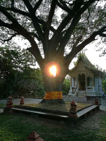 Buddha chapel at Wat Jed Yord.A big tree in front of chapel with sunset time made this place feel so peace.