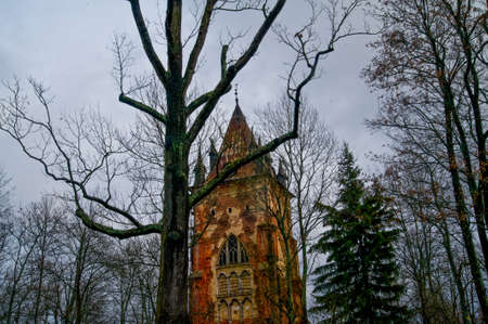 The tower of a beautiful old castle surrounded by autumn trees against a gray sky. Gothic style.